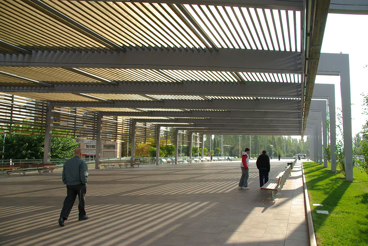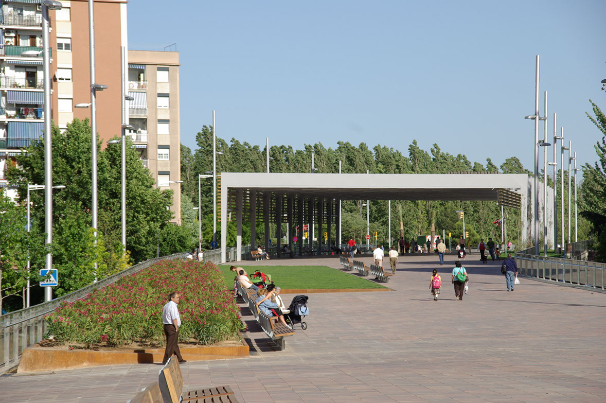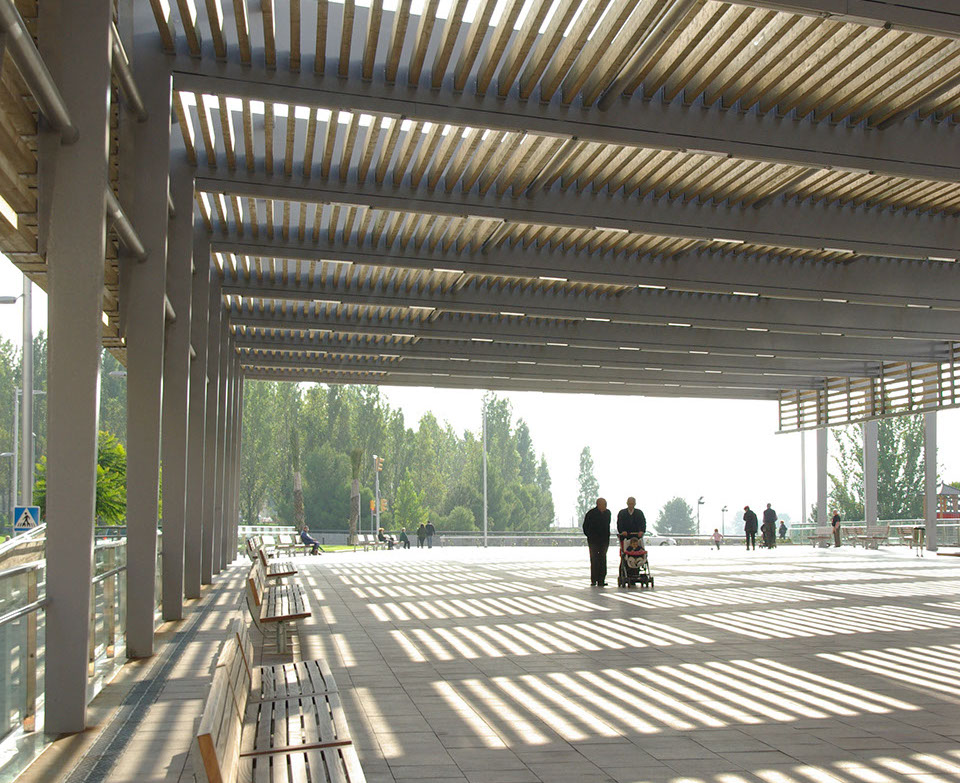 La nueva PÈRGOLA se materializa como un espacio de confluencia, de cruce de itinerarios, allá donde hay mas intensidad de los flujos peatonales, el espacio salón. Con esta ubicación ligeramente desplazada hacia el puente Edison, la nueva rambla queda presidida de una forma bipolar: con la estación de los FGC en el extremo Oeste, y con la pérgola a el extremo Este, como a contrapunto volumétrico y escalar en relación al barrio más cercano.
