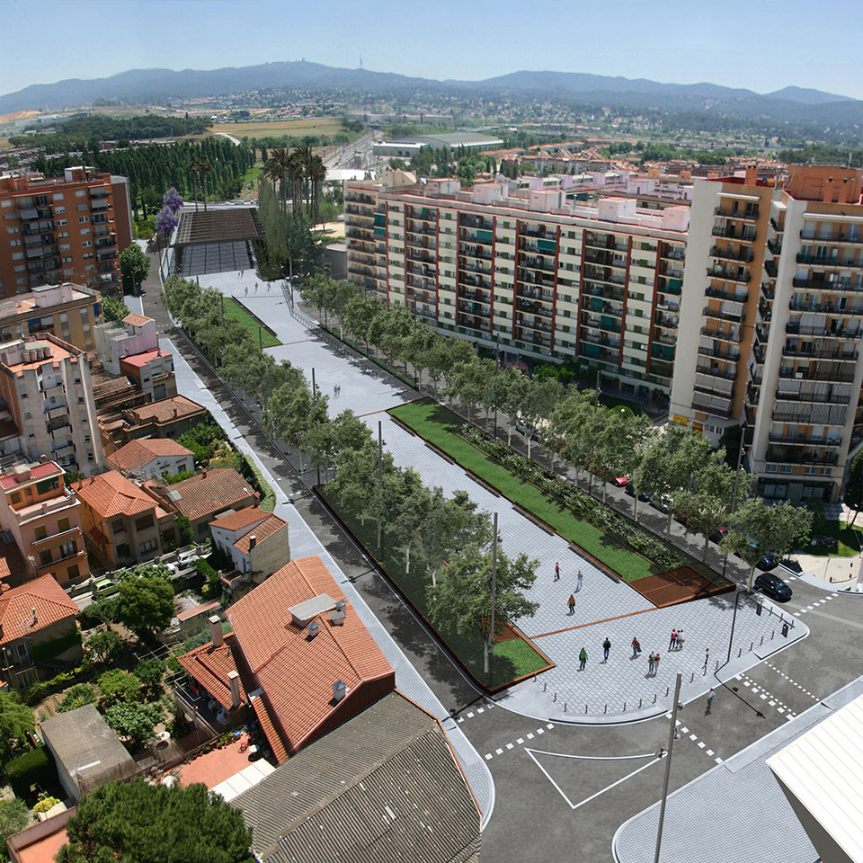 El reto principal del proyecto de urbanización ha consistido en convertir la situación de la zona en un nuevo espacio cívico con capacitad de integración del tejido urbano asumiendo las formas existentes y minimizando las problemáticas de comunicación. Se trata Es trata en fin, de conseguir la mayor permeabildad visual i peatonal mejorando accesos y recomponiendo el paisaje urbano integrando la presencia de los muros i loses que formen parte del cubrimiento del paso del ferrocarril.